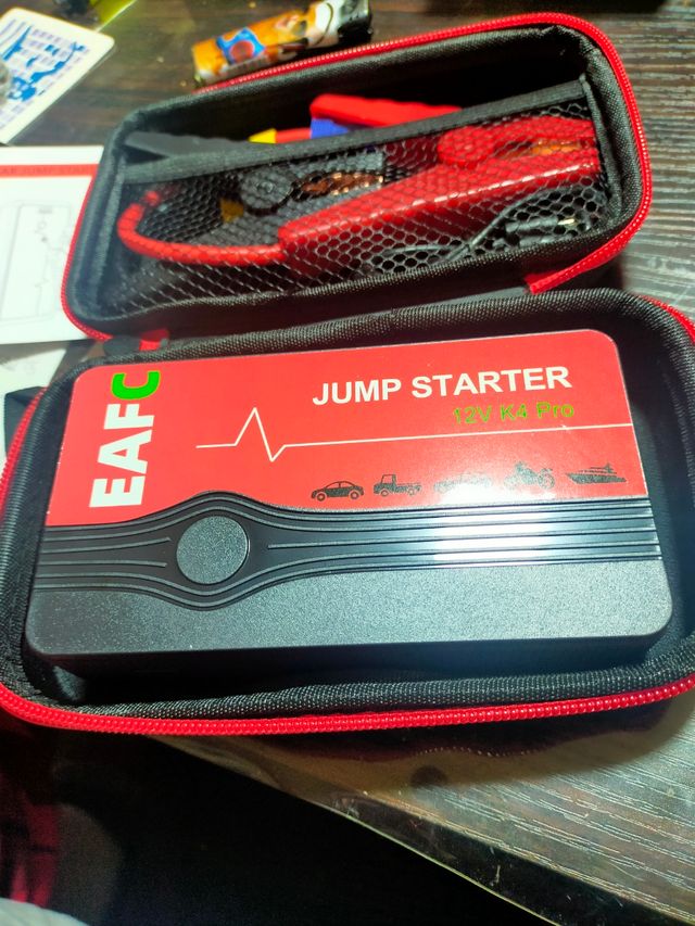 Arrancador de baterías para todo tipo de vehículos moto coche furgoneta etc .de poca cilindrada, que hace la función de la batería en caso de emergencia , incluye entradas de USB tipo C para cargar dispositivos en exteriores tipo camping y también linterna LED con varios modos de gran potencia