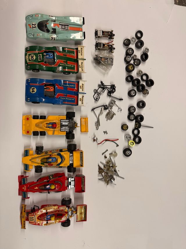 Detalles del productoLote de 7 coches de Scalextric, listos para la competición o para completar tu colección. Incluye varias piezas de repuesto y ruedas.