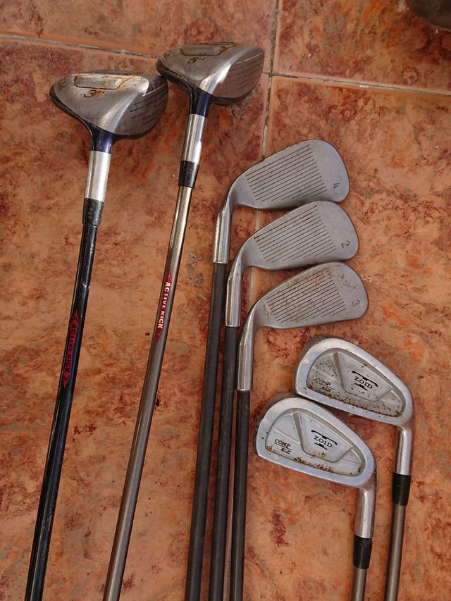 Conjunto de palos de golf de la marca Ping, modelo Accel-Arc. - Diseño clásico y elegante. - Empuñaduras de goma negra con detalles dorados. - Varillas metálicas.