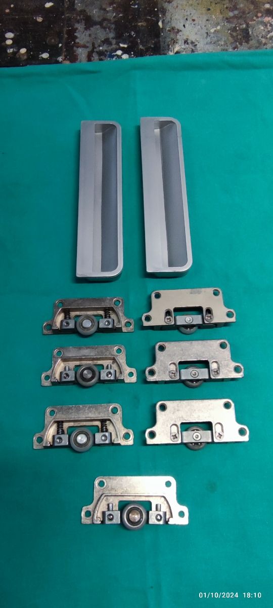 Lote de 7 ruedas para encastrar de puerta. Medidas 8 x 3.5 x 1.2 cms 2 tiradores plástico color aluminio Medidas 18 x 4 x 1.4 cms