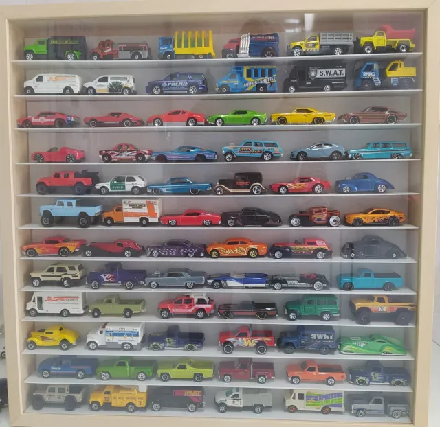 72 coches Hotwheels y Matchbox, escala 1:64, todos de coleccionista, nunca jugados, regalo vitrina que se ve en fotos.
