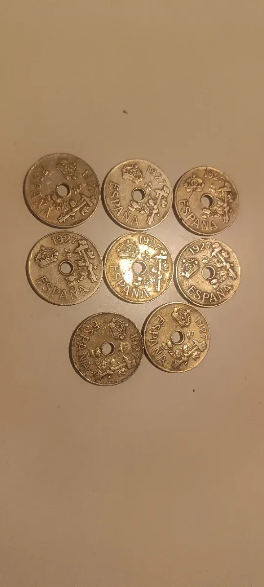 Detalles del productoConjunto de 8 monedas españolas del año 1927. Cada moneda presenta un diseño con la corona, ramas y el nombre ESPAÑA, además de un agujero central.