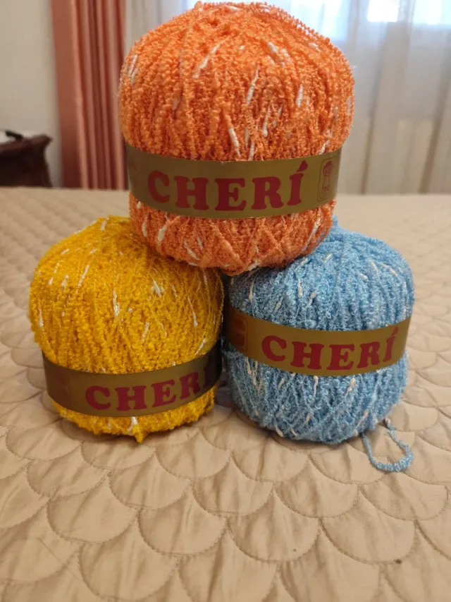 8 ovillos de lana para punto. 4 amarillo, 3 azul,