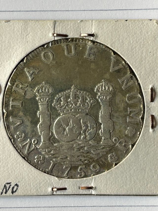 Moneda de 8 Reales de plata tipo columnario 1759 Fernando VI Peso: 26,6 gramos Diámetro: 39 mm.