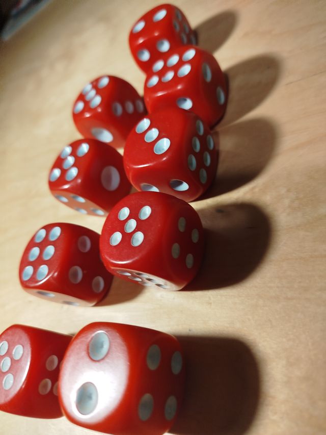 Conjunto de dados grandes de color rojo. Dos cm de alto. - Material: Plástico. - Color: Rojo con puntos blancos.