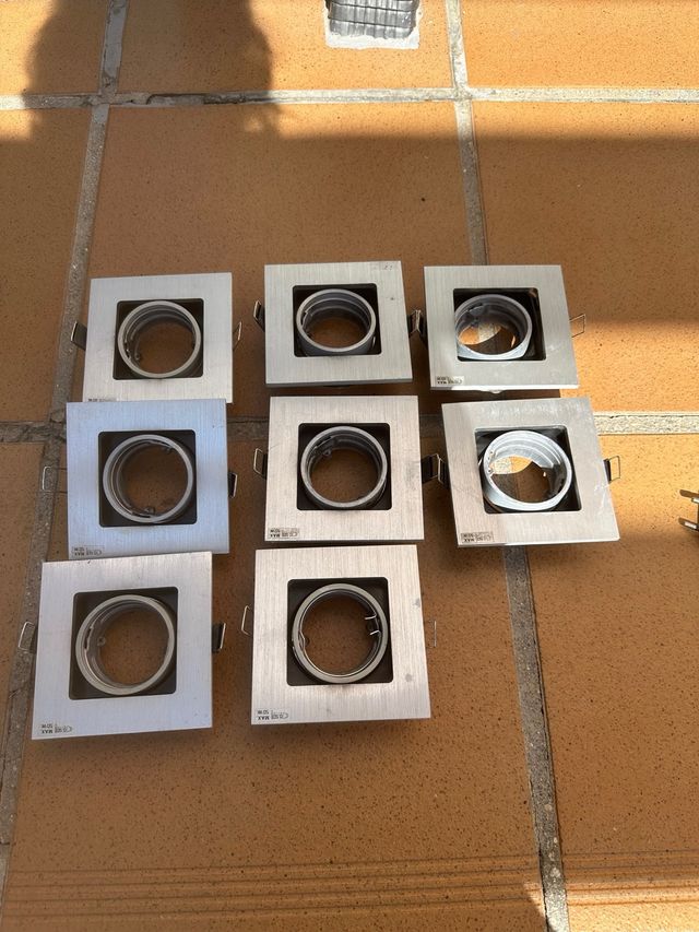 Detalles del productoSe venden 9 embellecedores empotrables para iluminación halógena. Son de color aluminio, estan en buen estado.