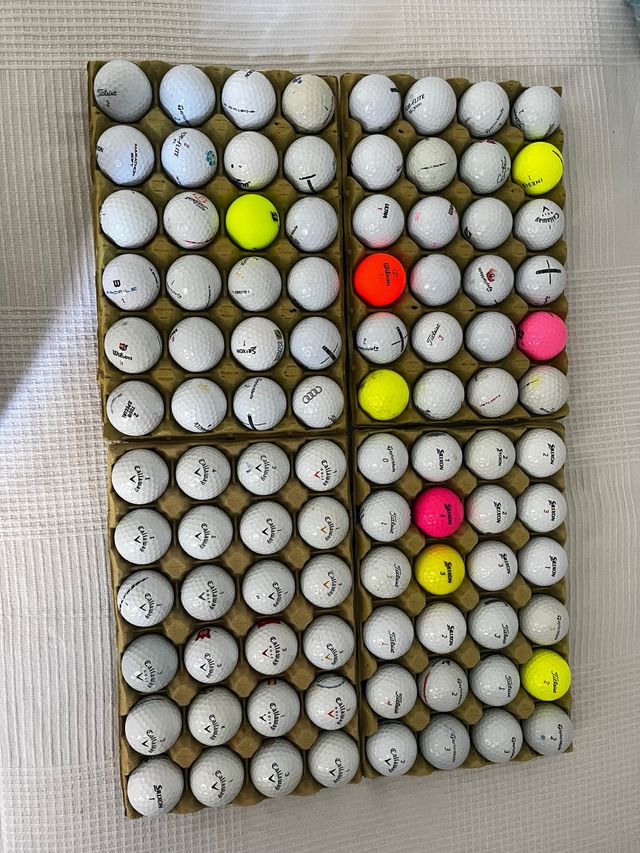Lote de 96 bolas de golf recuperadas, listas para tu próxima partida. - Variedad de marcas y modelos. - Ideales para jugadores que buscan una opción económica.