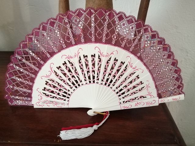 Detalles del productoPrecioso abanico de encaje de bolillos en color fucsia. Es un artículo delicado y vistoso, ideal para ocasiones especiales. Varillas de madera, pintadas de blanco y decoradas en fucsia, de Abanicos García, en Aldaia, Valencia. El abanico mide 42 cms abierto. El trabajo 7 cms. Hilo de reseguido muy colorido. Hecho a mano. Nuevo.