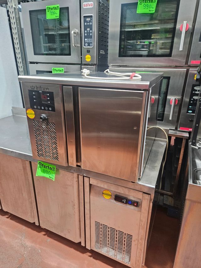 Detalles del productoAbatidor de temperatura INFRICO, para 3 bandejas gastronorm 1/1, con muy poco uso, dispone de ciclos personalizados con 3 fases de regulación, interfaz de usuario Touch-Screen con protección IP65, gestión de ciclos de abatimiento y sobrecongelación por temperatura y por tiempo, con función Hard/Soft y gestión de intensidad. sistema de frío forzado, gestión de test para comprobar que la sonda esté bien colocada, desescarche parada compresor, expansión válvula de expansión termostática, retorno automático, bloqueo apertura 95º. Sistema de ventilación y condensación frontal, etc... Mejor ver o probar. IVA no incluido. Medidas del producto
