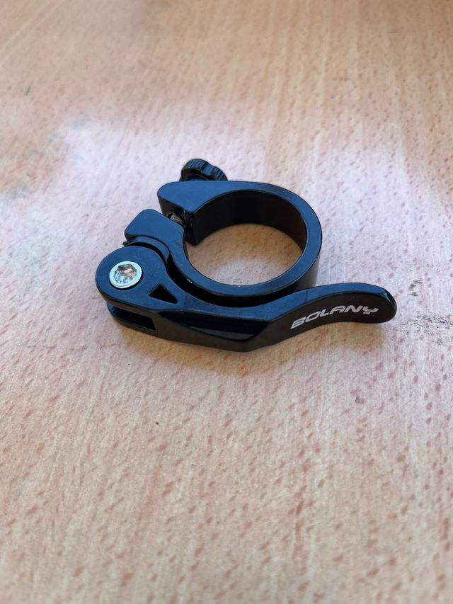 Abrazadera para tija de sillín de bicicleta. - Diámetro: 31.8 mm. - Color: Negro. - Material: Aluminio. - Cierre rápido.
