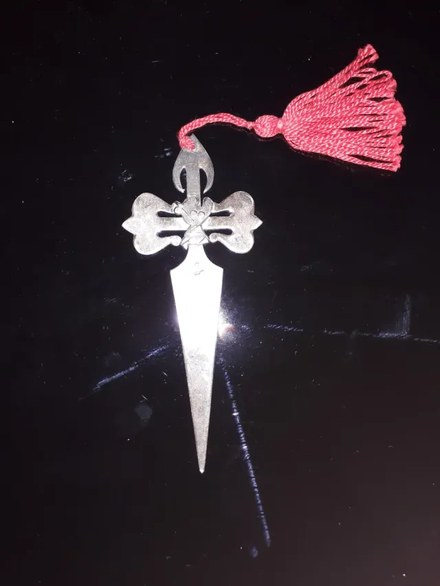 Elegante abrecartas con forma de la Cruz de Santiago. Vintag - Material: Plata. - Diseño: Cruz de Santiago con detalle de flor. - Adorno: Borla roja.