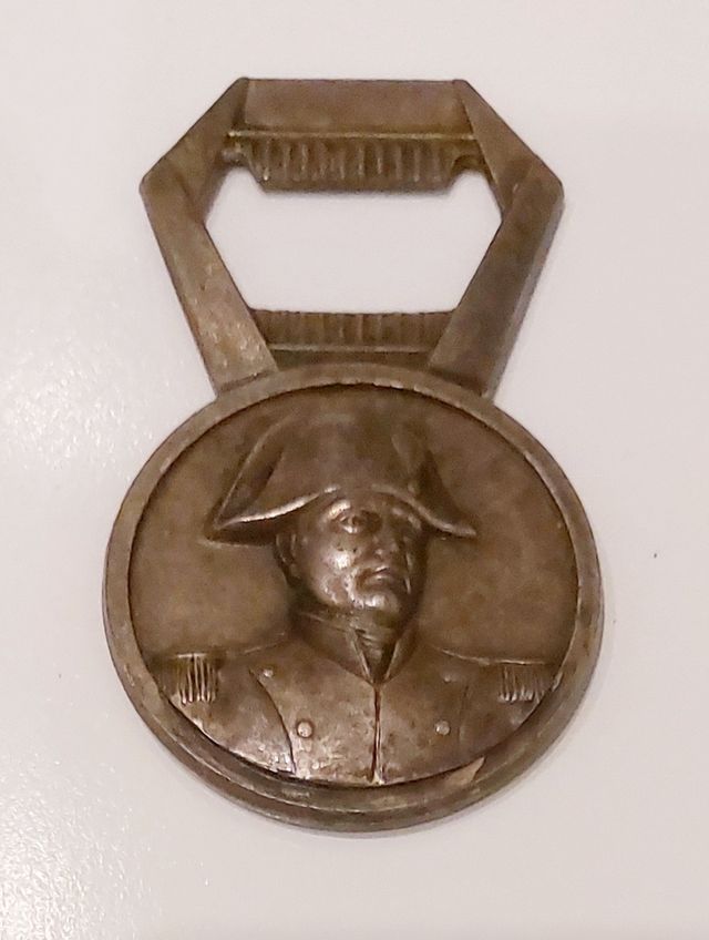 Detalles del productoAbridor de botellas antiguo con diseño de Napoleón en un lado y la Torre Eiffel en el otro.