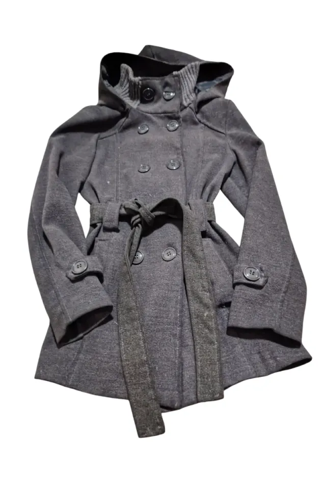 Abrigo corto gris con cinturón y capucha