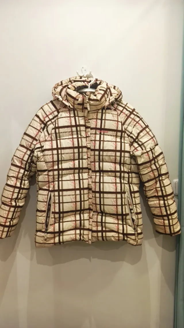 Abrigo de cuadros beige y marrón relleno de plumas