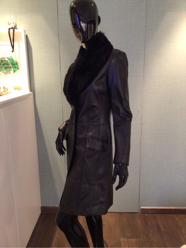 Abrigo de cuero negro con cuello de pelo