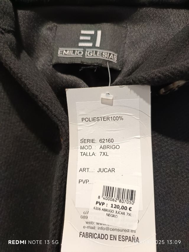 Abrigo de paño Emilio Iglesias Negro Talla 7XL