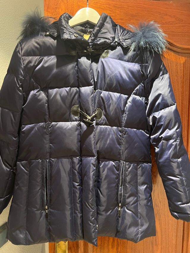 Abrigo de plumas azul con pelo natural