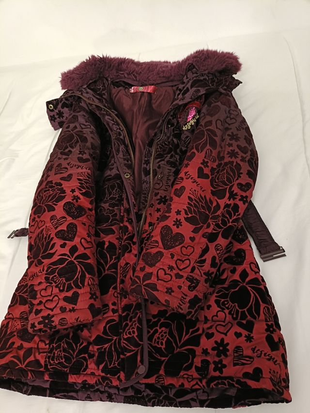 Detalles del productoAbrigo midi color burdeos, se adapta a la silueta es ideal para poner tanto con vestidos como con pantalones. Tiene relleno y en el cuello pelo que se puede quitar, el cuello se sube y las protege del frío, queda muy bonito, es muy elegante. Nos enamoramos de el, pero ahora a mí hija ya no le sirve por eso lo vendemos