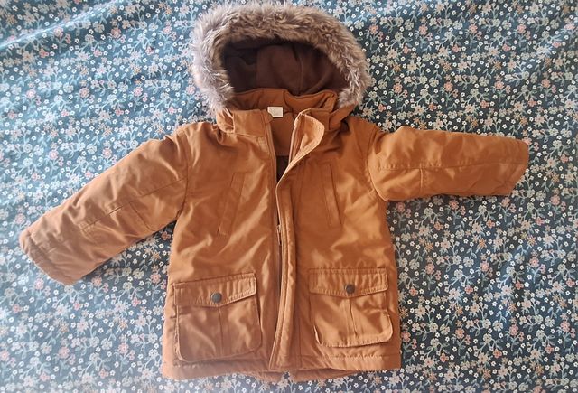 Abrigo infantil de color marrón con capucha y pelo sintético. - Talla 86. - Cierre de cremallera. - Dos bolsillos delanteros con botón. Sin usar, está en perfecto estado.