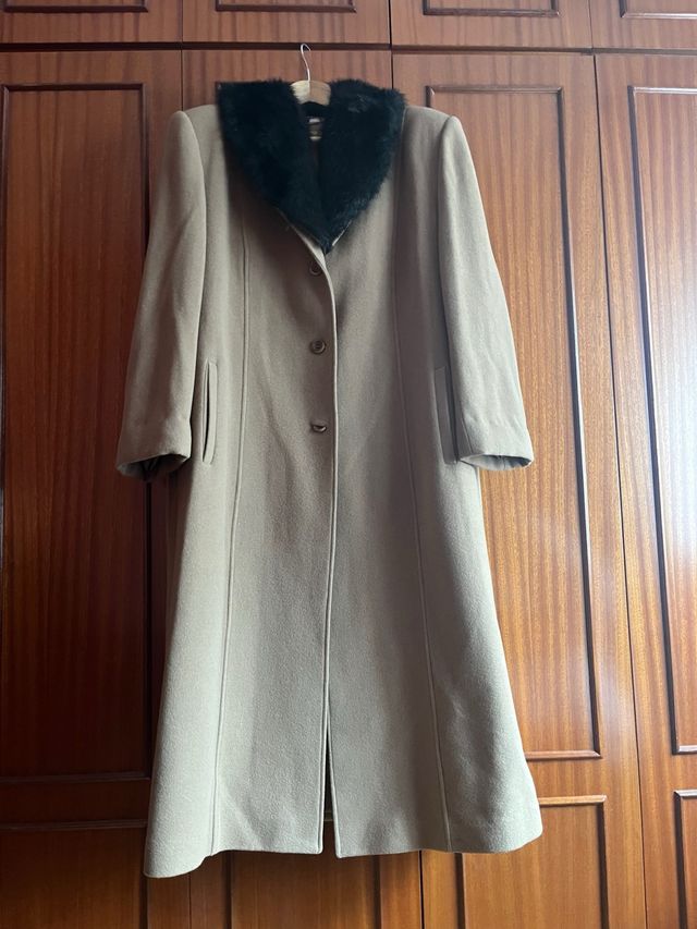 Abrigo largo beige con cuello de pelo negro