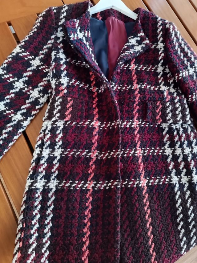Abrigo mujer, cuadros, lana, burdeos. El Ganso