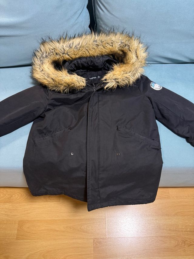 Abrigo negro Boohoo con capucha de pelo