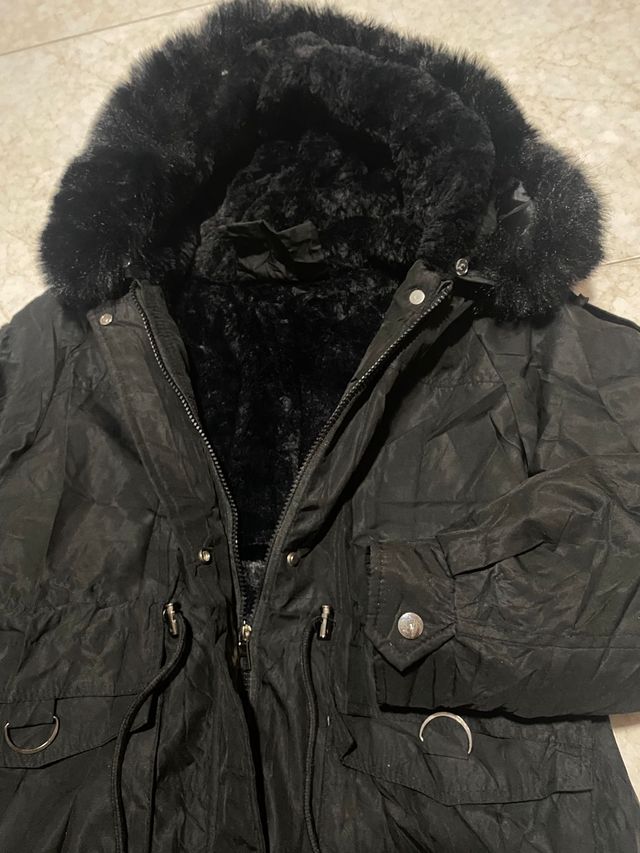 Abrigo negro con capucha y pelo