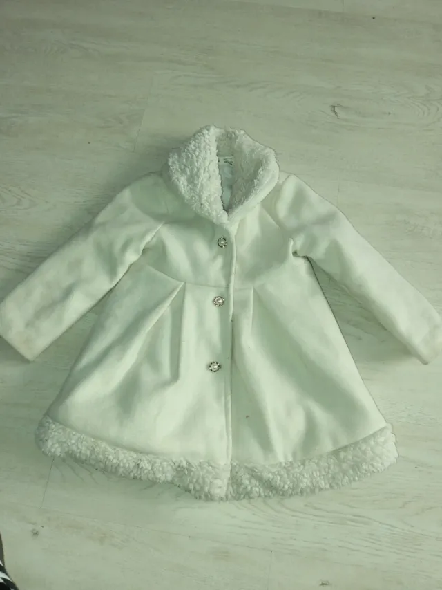 Abrigo blanco para niña con detalles de pelo. TALLA 2/3 Años - Cuello y bajo con pelo sintético. - Cierre de botones. - Diseño elegante.