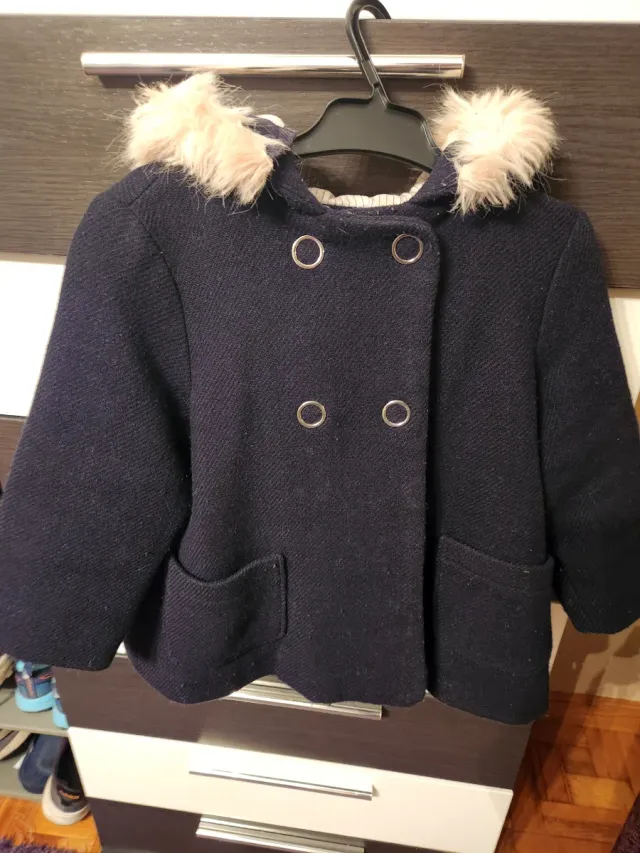 Detalles del productoAbrigo de Zara para niña en talla 3/4. Es un abrigo oscuro con detalles de pelo en la capucha y botones.