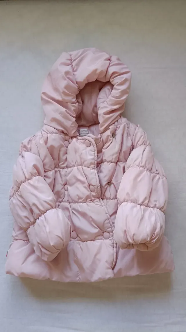 Abrigo acolchado de la marca Okaïbi en color rosa. - Talla 12 meses (74 cm). - Diseño con capucha. - Cierre de botones. - Mangas abullonadas.