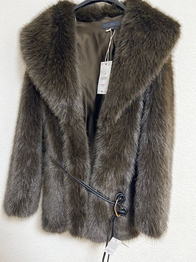 Elegante abrigo de pelo sintético de Zara. Cuenta con un cinturón para ajustar la cintura.