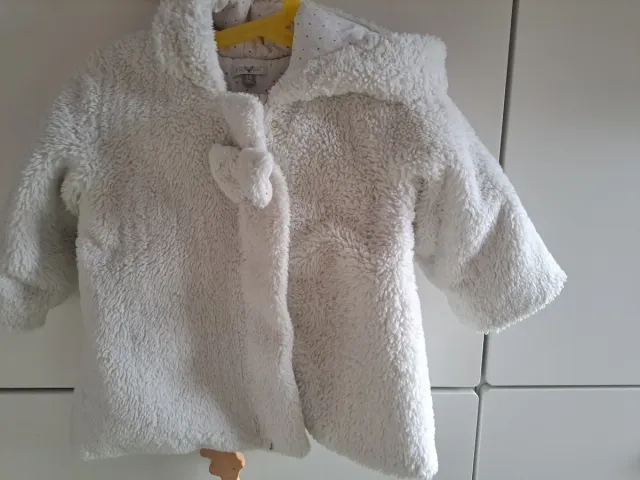 Abrigo de peluche blanco para bebé, muy suave y calentito. - Cierre con botón. - Detalle de lazo. - Capucha.