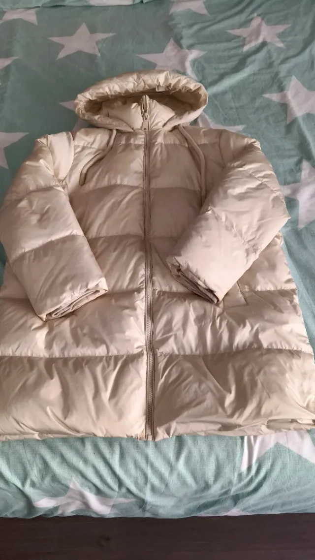 Abrigo plumas de Zara en color beige. Es una prenda cálida y cómoda.