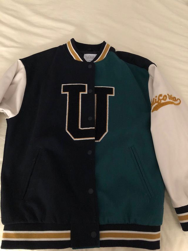 Detalles del productoAbrigo tipo chaqueta universitaria en color negro y verde, mangas en crudo tipo cuero. Bolsillos laterales y cierre de clip,elástico en cintura y puños. Forro grueso. Se ve sin compromiso