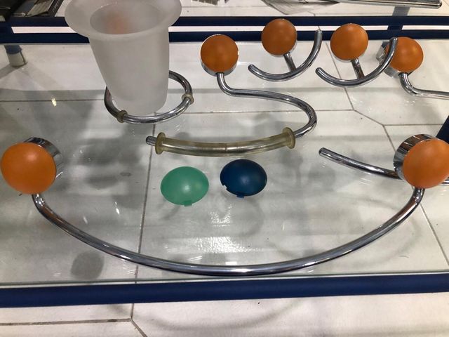 Color naranja azul y verde barra porta rollos, perchas, dos porta cepillos, vaso anilla. Accesorios completo de latón.