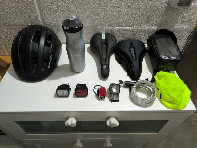 Detalles del productoVendo conjunto de accesorios para bicicleta prácticamente nuevos. Ideales para mantenerte seguro y cómodo en tus rutas.
