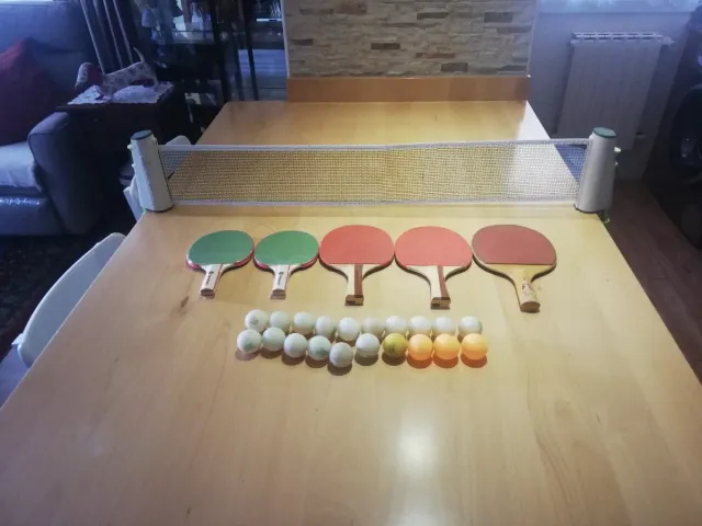 Detalles del productoConjunto de accesorios para jugar al ping pong. Incluye red extensible y portátil. 5 palas (las dos de la izq. sin estrenar, aún envueltas) y 20 pelotas