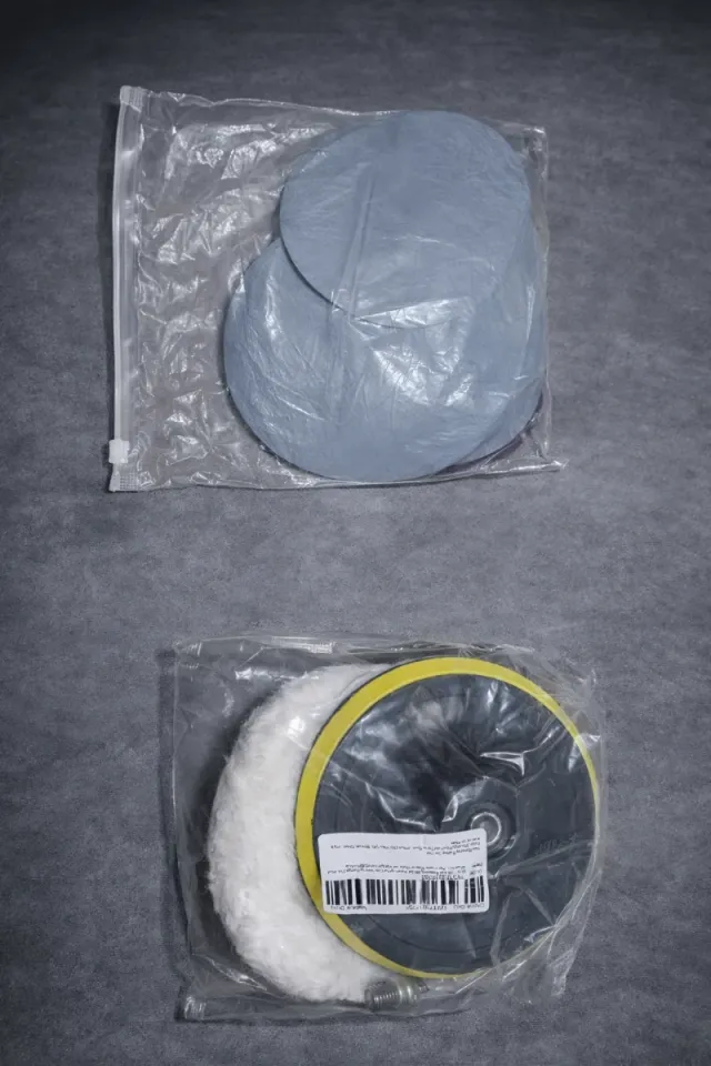 - Un disco de pulido negro con base amarilla con acople para el taladro.