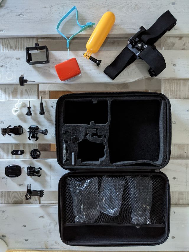 Detalles del productoLote de accesorios para cámaras GoPro, ideal para tus aventuras. Regalo funda troquelada.