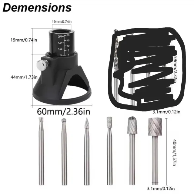 Detalles del productoSet de accesorios para herramientas rotatorias . Incluye fresas de diferentes formas y tamaños.