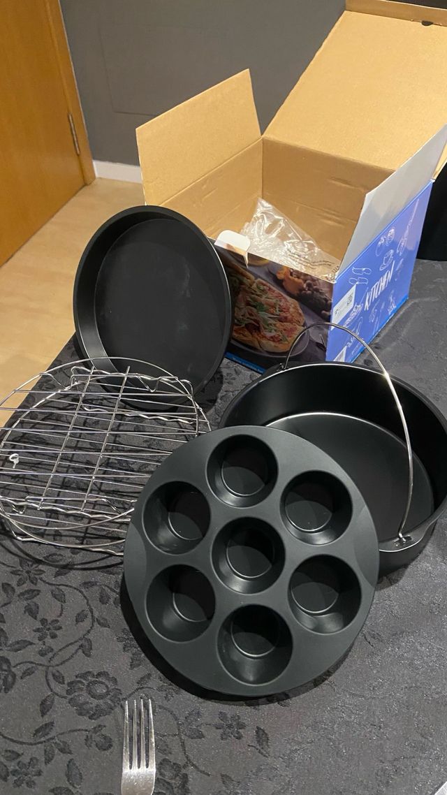 Conjunto de accesorios para freidora de aire Cosori. - Molde redondo para hornear. - Rejilla redonda. - Molde para muffins/cupcakes.