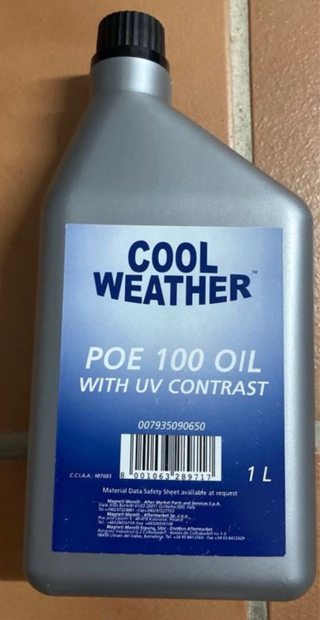 Detalles del productoAceite POE 100 con contraste UV, de la marca Magneti Marelli, diseñado para sistemas de climatización.