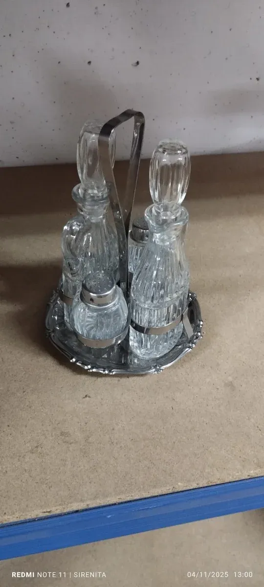 Aceitera y salero de cristal y metal