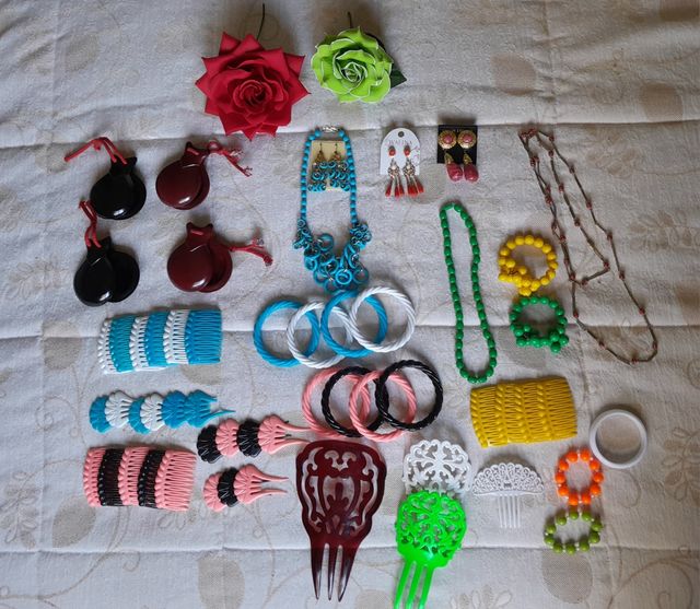 Detalles del productoVendo conjuntos de acesorios o separados de flamenca. -2 peinecillos a 1 euros. -juego de pendientes y collar a 5 euros. -2 pulseras a 3 euros. -flor a 3 euros. -castañuelas sin estrenar a 8 euros. -Zapatos de flamenca en rojo n°38 con las tapas de repuesto a 15 euros, puestos sólo 1 vez, marca el zapato rojo.
