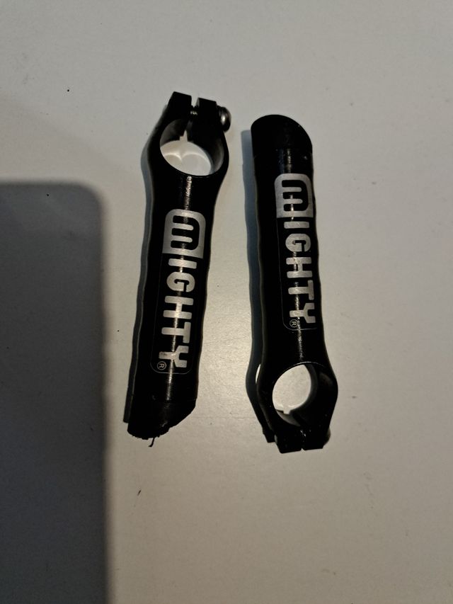 Acoples para manillar de bicicleta de montaña de la marca Mighty. Fabricados en aluminio negro. -Muy ligeros - Diseño ergonómico. - Logotipo de la marca visible.