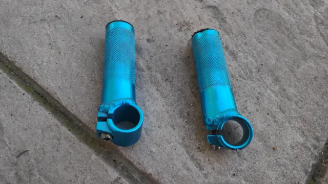 Par de acoples para manillar de bicicleta en color azul. Aluminio - Diseño molereado para mejor agarre. - Incluye tornillería para sujeción.