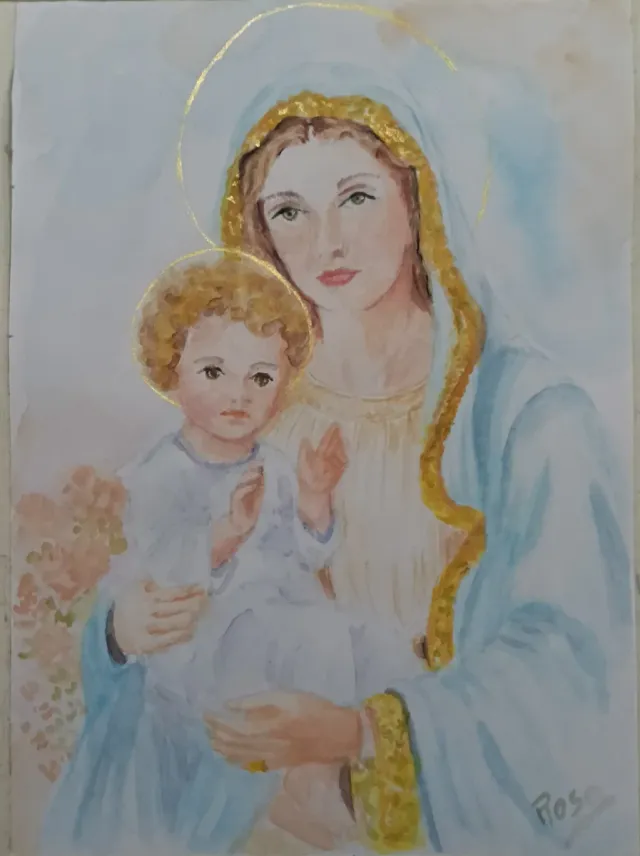 Preciosa acuarela de la Virgen María con el Niño Jesús. Una obra de arte delicada y llena de ternura. - Pintura sobre papel. - Dellalles dorados
