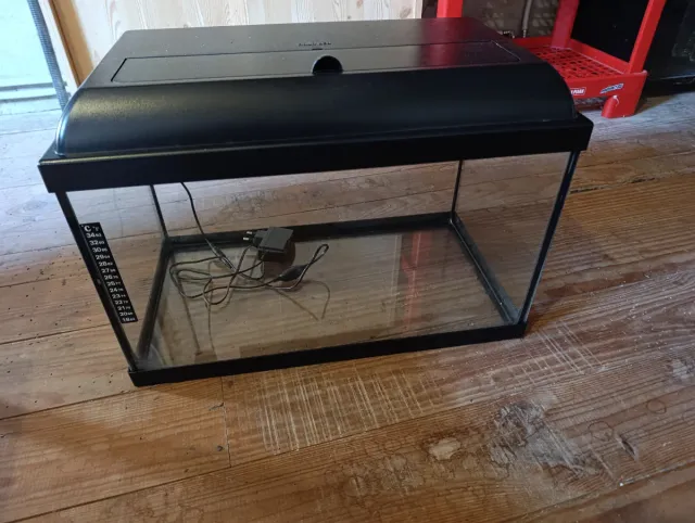 Acuario de cristal con marco negro y tapa superior. - Incluye termómetro adhesivo con escala en grados Celsius. - Cable de alimentación con enchufe. -Luz led.