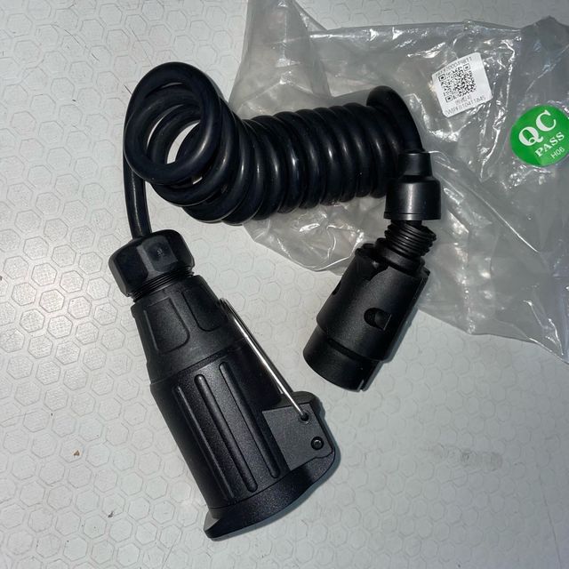 Detalles del productoAdaptador de cable en espiral para remolque. El cable es de color negro y tiene un diseño en espiral para mayor flexibilidad y organización.