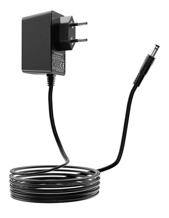 Detalles del productoAdaptador de corriente negro con cable enrollado.